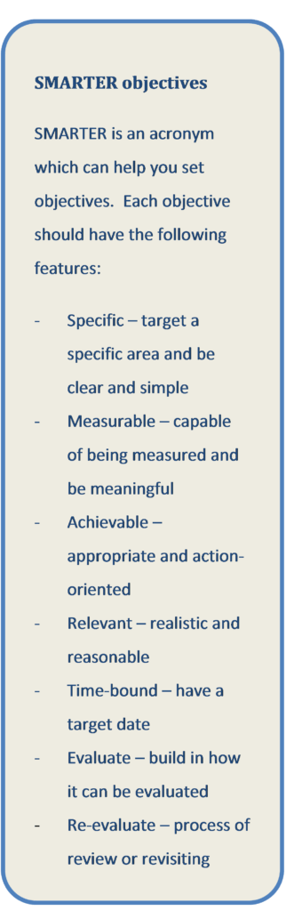 Ideally any goals you set should be measurable and include a specific time target. Some goals will be easy to measure, for example, whether or not you hold a District camp biannually will be obvious, but how would you measure re-energising the Support Group? Such a measure might be reflected in numbers attending meetings, volunteers for activities, nominations for roles or achieving a fundraising target.